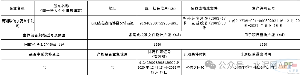 根據《水泥玻璃行業(yè)產能置換實施辦法(2024年本)》等文件要求,安徽海螺水泥股份有限公司白馬山水泥廠1條4000t/d水泥熟料生產線通過補產能方式將產能增加到5250t/d,置換產能來自蕪湖市華楊水泥有限責任公司、蕪湖瑞信水泥有限公司,置換比例為2:1。