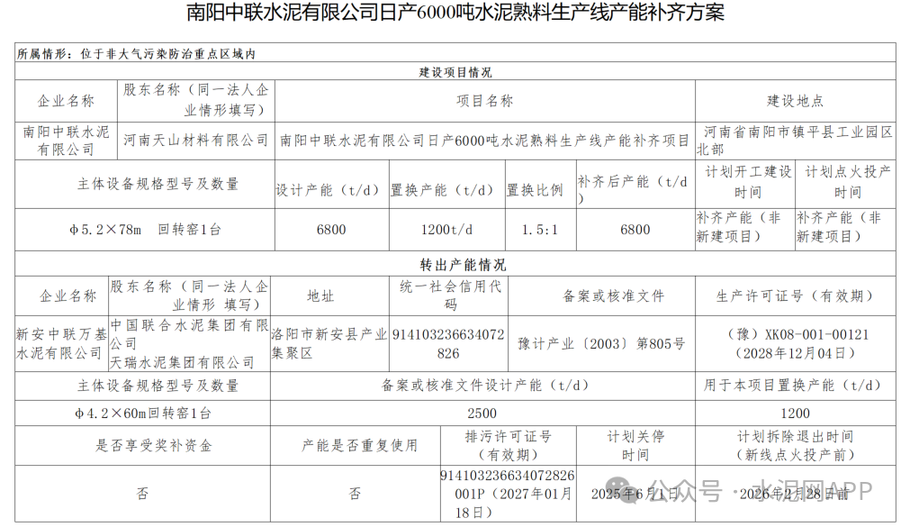 根據(jù)公示,南陽中聯(lián)水泥6000t/d補(bǔ)充800t/d產(chǎn)能至6800t/d,退出生產(chǎn)線來自新安中聯(lián)萬基水泥2500t/d(1200t/d用于本項目)生產(chǎn)線,置換比例1.5:1。