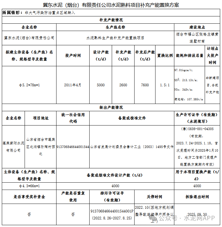 公示顯示,冀東水泥(煙臺)5000t/d熟料生產線補充產能2600t/d,補充后產能為7600t/d,退出產能來自蓬萊蔚陽水泥有限公司一條4000t/d熟料生產線,置換比例1.5:1。