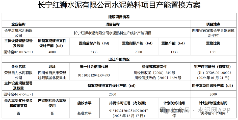 長寧紅獅水泥4000t/d熟料生產線補充1333t/d產能,補充后產能為5333t/d,出讓產能來自榮縣自力水泥有限公司一條2000t/d熟料線,置換比例1.5:1。