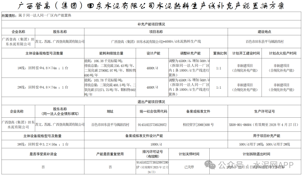 廣西登高(集團(tuán))田東水泥1#、2#4000t/d生產(chǎn)線各補(bǔ)充產(chǎn)能500t/d,退出產(chǎn)能來自同公司3#1000生產(chǎn)線,置換比例1:1。