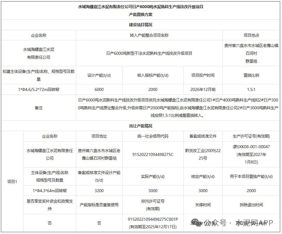 另據此前貴州工信廳發(fā)布,水城海螺盤江水泥6000t/d技改升級項目產能置換方案如下: