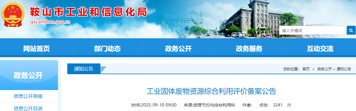 按照工信部《工業(yè)固體廢物資源綜合利用評價管理暫行辦法》、《國家工業(yè)固體廢物資源綜合利用產(chǎn)品目錄》、省工信廳《遼寧省工業(yè)和信息化廳關(guān)于做好工業(yè)固體廢物資源綜合利用評價工作的通知》(遼工信資源〔2023〕129號)及《鞍山市工業(yè)固體廢物資源綜合利用評價管理實施辦法》要求,2025年9月3日-2025年9月9日,我局對鞍山廈美環(huán)保科技有限公司、鞍山昊通新材料有限公司、鞍鋼綠色資源科技有限公司工業(yè)固體廢物綜合利用評價進行備案公示。截至公示期結(jié)束,未收到不同意見,現(xiàn)予以公布。