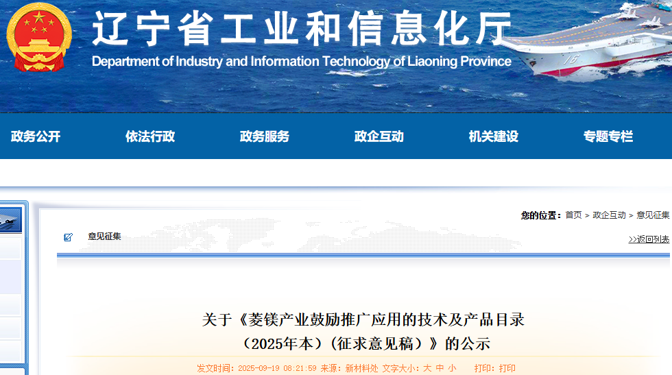 按照《遼寧省人民政府辦公廳關(guān)于推進菱鎂行業(yè)高質(zhì)量發(fā)展的實施意見》(遼政辦發(fā)〔2023〕15號)精神,為持續(xù)搭建技術(shù)交流平臺,推動新技術(shù)、新產(chǎn)品成果轉(zhuǎn)化,持續(xù)提升菱鎂行業(yè)高端化、智能化、綠色化水平。經(jīng)企事業(yè)單位自主申報、市工信局推薦,我廳征集了已進入或接近產(chǎn)業(yè)化應(yīng)用階段、有推廣應(yīng)用意向、暫無社會異議的22項新技術(shù)、新產(chǎn)品,經(jīng)相關(guān)專家論證,現(xiàn)將《菱鎂產(chǎn)業(yè)鼓勵推廣應(yīng)用的技術(shù)及產(chǎn)品目錄(2025年本)(征求意見稿)》予以公示,公示期為5個工作日。