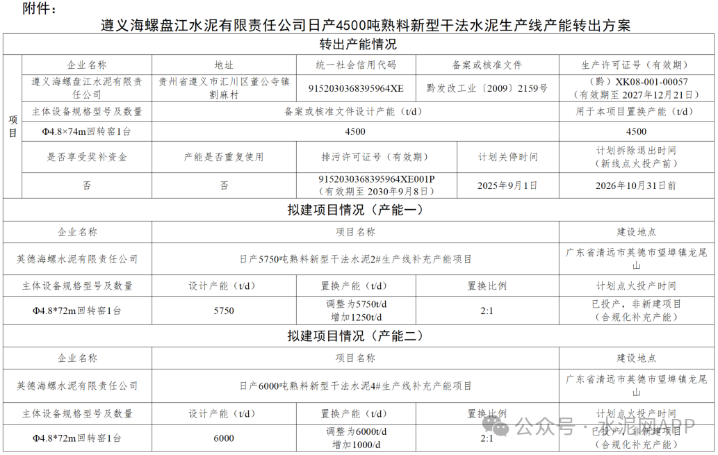 置換方案顯示,遵義貴州盤江水泥一條4500t/d生產(chǎn)線產(chǎn)能轉(zhuǎn)出,其中2500t/d產(chǎn)能用于補充英德海螺水泥2#生產(chǎn)線,2000t/d產(chǎn)能補充英德海螺水泥4#生產(chǎn)線,置換比例均為2:1。