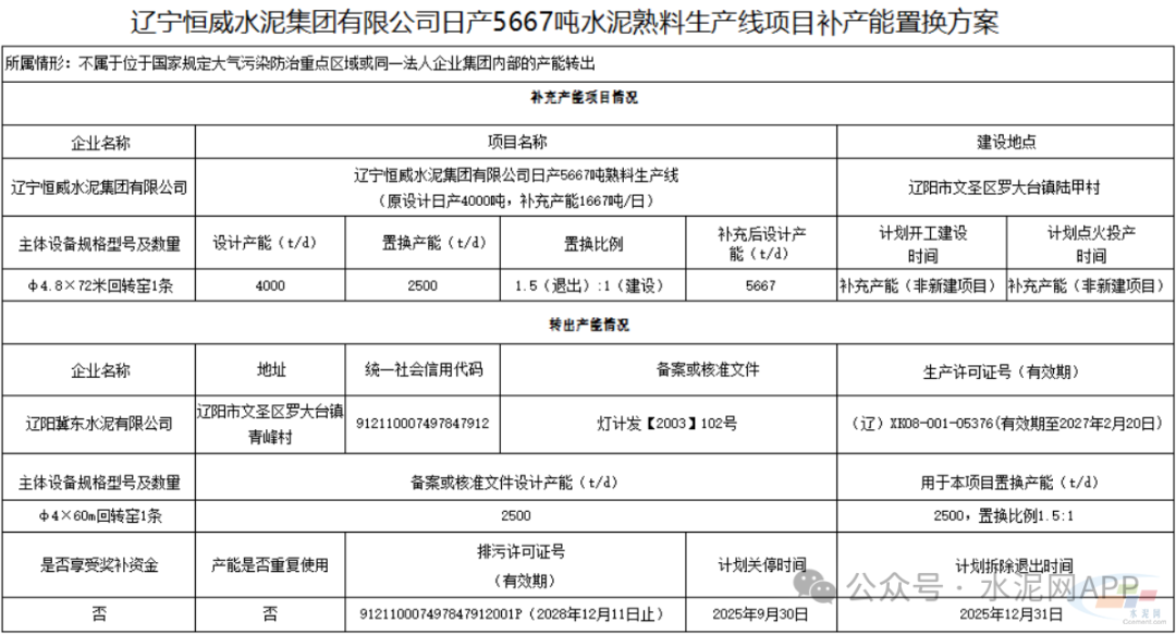 置換方案顯示,遼寧恒威水泥4000t/d熟料生產(chǎn)線補(bǔ)充產(chǎn)能1667t/d,補(bǔ)充后產(chǎn)能為5667t/d,退出產(chǎn)能來(lái)自遼陽(yáng)冀東水泥一條2500t/d熟料生產(chǎn)線。