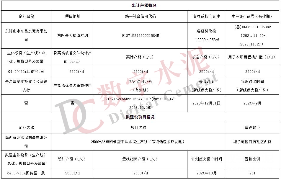 根據(jù)公示內(nèi)容,東阿山水東昌水泥有限公司東阿縣大橋鎮(zhèn)駐地2500t/d水泥熟料生產(chǎn)線產(chǎn)能出讓,受讓產(chǎn)能點火投產(chǎn)前拆除退出。受讓產(chǎn)能雞西賽龍水泥制造有限公司擬在黑龍江省雞西市城子河區(qū)白石社區(qū)西側(cè)建設(shè)一條2500t/d熟料新型干法水泥生產(chǎn)線(帶純低溫余熱發(fā)電),置換比例為2:1,計劃2024年10月投產(chǎn)。