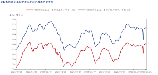 圖五:2023-2025年國內(nèi)247家鋼鐵企業(yè)高爐開工率和產(chǎn)能利用率走勢(shì)圖