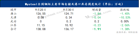 通過對(duì)全國六城20家主流倉庫及港口進(jìn)行調(diào)查統(tǒng)計(jì),當(dāng)前9月30日鋼坯倉儲(chǔ)庫存136.17萬噸,周環(huán)比減少1.91萬噸。從重點(diǎn)區(qū)域來看,唐山鋼坯庫存124.71萬噸,周環(huán)比下降1.84萬噸。其中三大主流倉儲(chǔ)庫存周環(huán)比增加0.86萬噸,下游調(diào)坯廠需求減少,鋼坯倉儲(chǔ)庫存由降轉(zhuǎn)增。而港口庫存因?yàn)槌隹谫Y源疏港下降2.7萬噸,港口庫存的下降導(dǎo)致唐山整體庫存的下降。