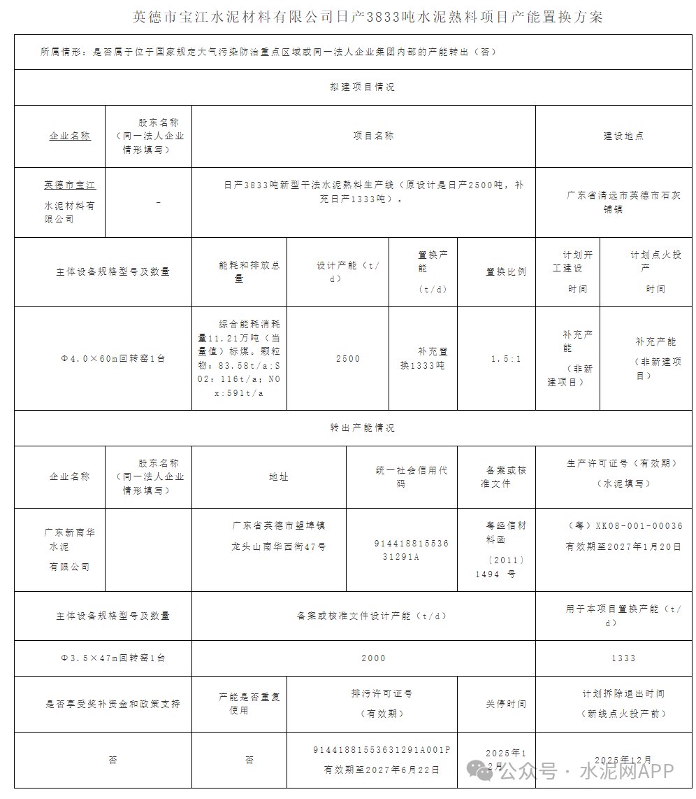 置換方案顯示,英德市寶江水泥2500t/d生產(chǎn)線補(bǔ)充產(chǎn)能1333t/d,補(bǔ)充后產(chǎn)能達(dá)3833t/d,退出產(chǎn)能來(lái)自廣東新南華水泥有限公司一條2000t/d生產(chǎn)線,置換比例1.5:1。