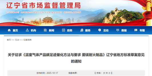 《溫室氣體產(chǎn)品碳足跡量化方法與要求 菱鎂耐火制品》遼寧省地方標準草案已完成,現(xiàn)公開征求意見。請于2025年11月17日前,將意見反饋至遼寧省市場監(jiān)督管理局標準處。