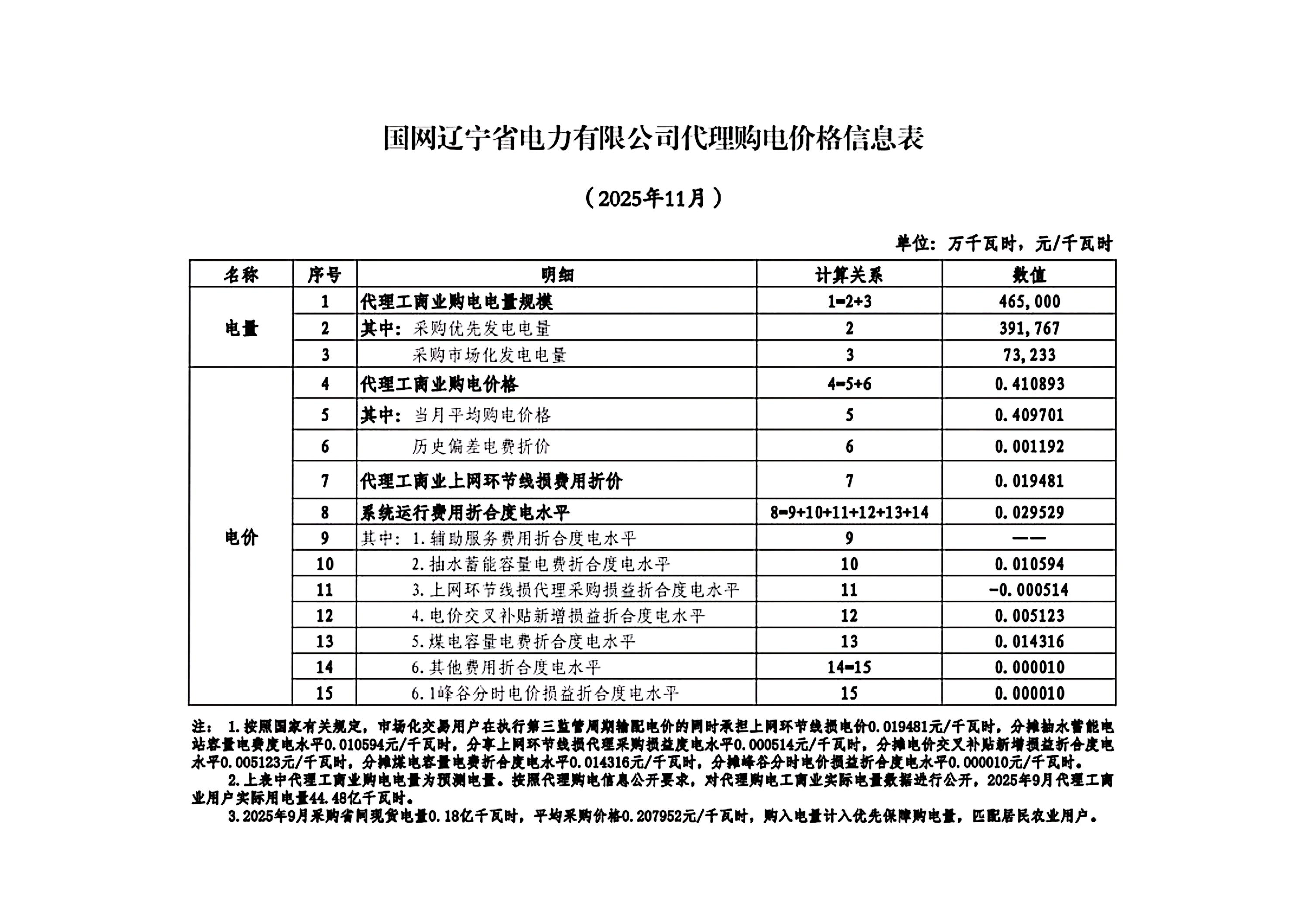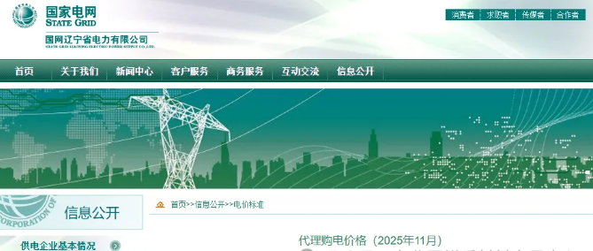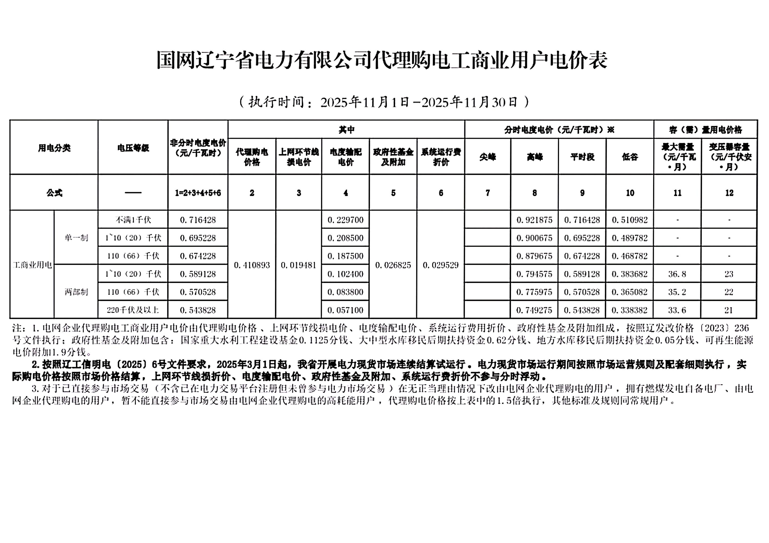 國網(wǎng)遼寧省電力有限公司代理購電工商業(yè)用戶電價表(2025年11月)
