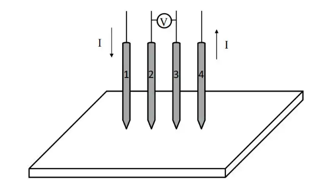 2、四探針?lè)ㄡ槍?duì)兩探針?lè)椒ǖ姆N種不足,開(kāi)爾文男爵發(fā)展了四探針技術(shù)。其工作原理如下圖所示,通常四個(gè)探針沿一條直線(xiàn)等間距排列,外側(cè)兩個(gè)探針(探針 1 和 4)傳輸電流,內(nèi)側(cè)兩個(gè)探針測(cè)量電壓。恒流源輸出電流 I 到探針 1,電流流經(jīng)樣品后經(jīng)探針4 流出形成電流回路。探針 2 和 3 連接電壓表,測(cè)量探針兩端的電壓,形成電壓回路。電流和電壓測(cè)量不共用探針,而是由各自的一對(duì)探針形成回路。根據(jù)歐姆定律可得到樣品的電阻值。電壓表的內(nèi)阻通常在 109 ? 以上,因此流過(guò)電壓探針 2 和 3 的電流接近零,因此探針 2 和 3 自身電阻產(chǎn)生的電壓降也接近零,可以忽略。這樣就規(guī)避了導(dǎo)線(xiàn)電阻、探針電阻以及探針與材料的接觸電阻的影響,因此四探針?lè)椒ū葍商结樂(lè)y(cè)量精度更高,適用范圍更廣。