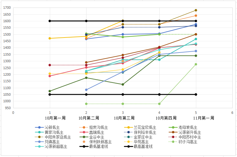 第三階段(10月第四周 - 11月第一周):呈現(xiàn)“高位沖刺” 態(tài)勢,如沁新低硫主焦?jié)q至1575元/噸;中陽朱家店低硫主焦沖至1680 元/噸;擔炭溝低硫主焦從1575元/噸躍升至1640元/噸;豹子溝高硫主焦從980元/噸沖至1276元/噸。