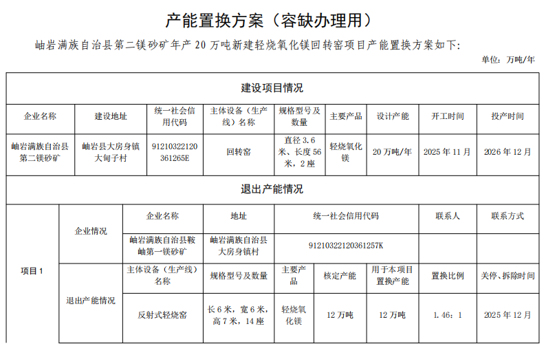3.岫巖滿族自治縣第二鎂砂礦年產(chǎn)20萬噸新建輕燒氧化鎂回轉(zhuǎn)窯項目產(chǎn)能置換方案