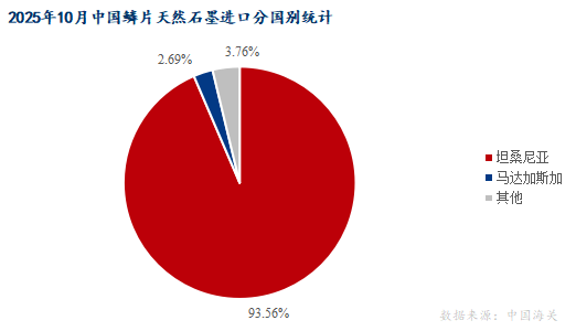 2025年10月天然鱗片石墨進(jìn)口的3613.813噸,從坦桑尼亞進(jìn)口量最大,占比為93.56%,從馬達(dá)加斯加進(jìn)口量占比為2.69%,其他貿(mào)易伙伴進(jìn)口總量為135.765噸,總占比不足4%。