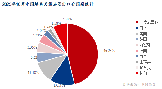 2025年10月天然鱗片石墨出口13150.379噸,其中印度尼西亞出口量最大為6079.900噸,占總比重的46.23%,其次是日本出口量為1733.511噸,占總比重的13.18%,其他貿(mào)易伙伴出口量總共占比為7.38%。