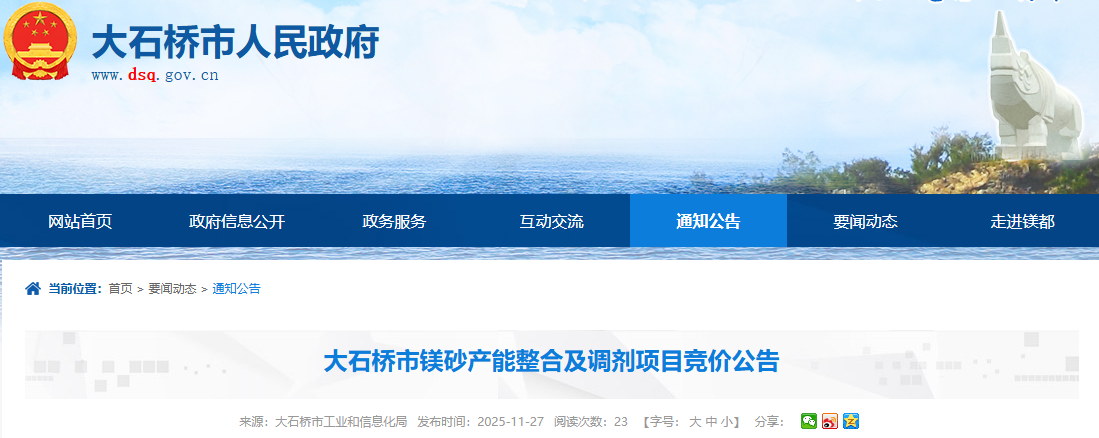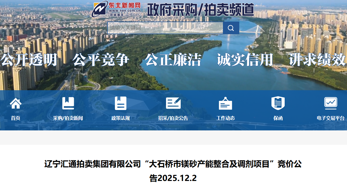 為貫徹落實(shí)大石橋市菱鎂產(chǎn)業(yè)結(jié)構(gòu)調(diào)整與轉(zhuǎn)型升級的戰(zhàn)略部署,優(yōu)化資源配置,實(shí)現(xiàn)高質(zhì)量發(fā)展。根據(jù)大石橋市鎂砂產(chǎn)能整合及調(diào)劑工作的總體安排,大石橋市政府責(zé)成大石橋市工業(yè)和信息化局委托遼寧匯通拍賣集團(tuán)有限公司,就已列入大石橋市850萬噸壓減目標(biāo)以及完成產(chǎn)能整合且已在大石橋市工業(yè)和信息化局報(bào)備的整合方企業(yè),擬于2025年12月2日組織公開競價(jià)活動,以確定產(chǎn)能整合及調(diào)劑的受讓方及補(bǔ)償金額。
