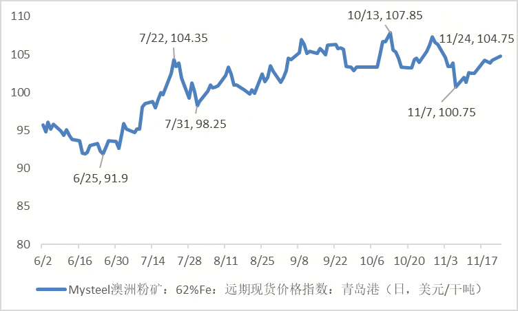 近期市場(chǎng)關(guān)注鐵礦石價(jià)格上漲。單從近兩周的表現(xiàn)來看, Mysteel鐵礦石62%價(jià)格指數(shù)自11月7日的階段性低點(diǎn)100.75美元/噸上漲至11月24日的104.75美元/噸,上漲4美元/噸,漲幅3.97%。
