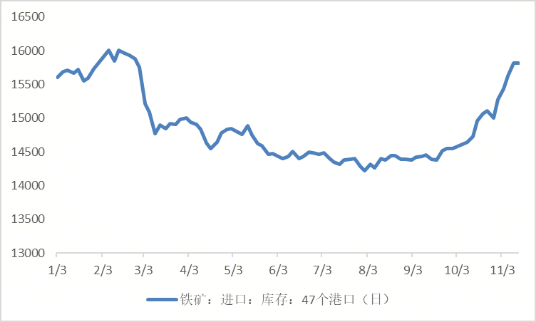 綜合影響47港進(jìn)口礦庫(kù)存連續(xù)7周攀升至11月14日的15813萬噸,較國(guó)慶節(jié)前增加1262萬噸。