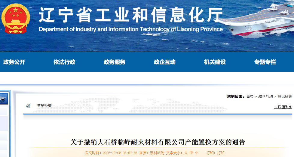 2025年10月10日,我廳對(duì)大石橋臨峰耐火材料有限公司新建輕燒氧化鎂項(xiàng)目產(chǎn)能置換方案進(jìn)行了通告。因市場(chǎng)供需發(fā)生變化等原因,企業(yè)決定終止相關(guān)項(xiàng)目的建設(shè)。經(jīng)企業(yè)和營(yíng)口市工信局申請(qǐng),現(xiàn)將《關(guān)于營(yíng)口關(guān)山耐火材料有限公司等企業(yè)新建輕燒氧化鎂項(xiàng)目產(chǎn)能置換方案的通告》中大石橋臨峰耐火材料有限公司年產(chǎn)10萬(wàn)噸輕燒氧化鎂產(chǎn)品塔式組合自動(dòng)化環(huán)保豎窯及配套生產(chǎn)線建設(shè)項(xiàng)目產(chǎn)能置換方案予以撤銷。