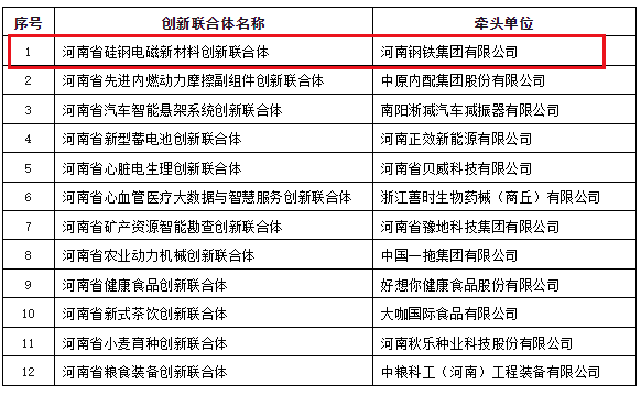 河南省科技廳近日公示,擬組建12家河南省創(chuàng)新聯(lián)合體,包括河南鋼鐵集團牽頭的河南省硅鋼電磁新材料創(chuàng)新聯(lián)合體等。