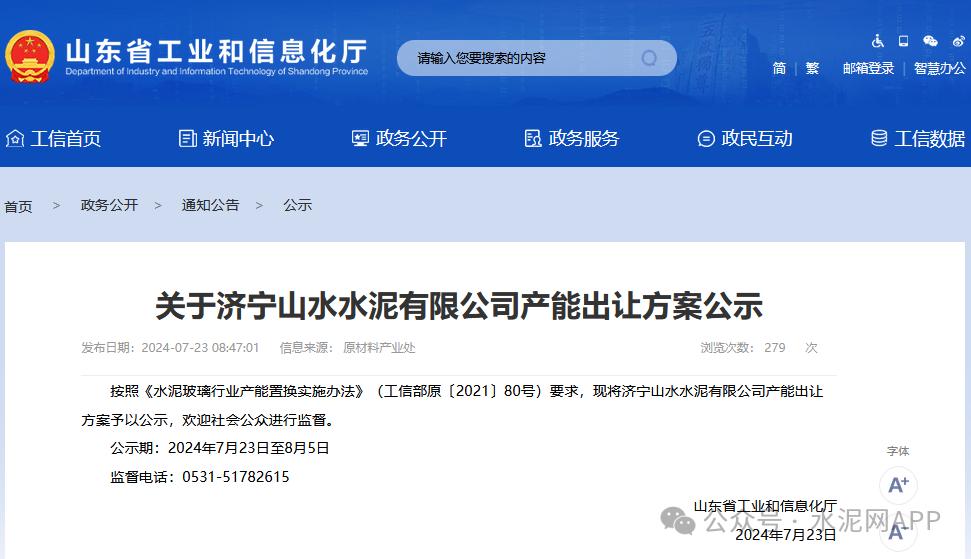7月23日,山東省工業(yè)和信息化廳發(fā)布《關(guān)于濟寧山水水泥有限公司產(chǎn)能出讓方案公示》。
