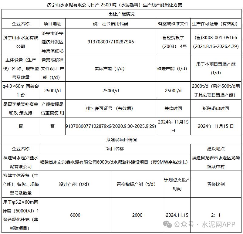 根據(jù)公示,福建省永定興鑫水泥有限公司擬在福建省龍巖市永定區(qū)龍?zhí)舵?zhèn)聯(lián)中村建設(shè)一條6000t/d水泥熟料建設(shè)項目(帶9MW余熱發(fā)電),置換比例2:1,計劃2024年11月15日點火投產(chǎn)。用于本項目置換產(chǎn)能為濟寧山水水泥有限公司2000t/d(另外500t/d用于其它項目置換產(chǎn)能)φ4.0×60m 回轉(zhuǎn)窯1臺,計劃2024年11月15日拆除退出。