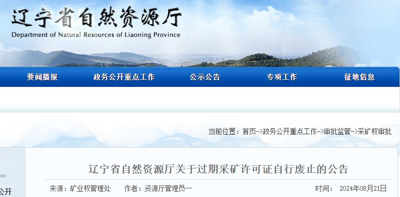根據(jù)《礦產(chǎn)資源開(kāi)采登記管理辦法》(國(guó)務(wù)院令第241號(hào))和《自然資源部關(guān)于進(jìn)一步完善礦產(chǎn)資源勘查開(kāi)采登記管理的通知》(自然資規(guī)〔2023〕4號(hào))等有關(guān)規(guī)定,經(jīng)核實(shí),海城市旭益升菱鎂石采掘有限公司采礦許可證在有效期屆滿前未依法申請(qǐng)辦理延續(xù)登記手續(xù),采礦許可證自有效期屆滿之日起已經(jīng)自行廢止,現(xiàn)予以公告。