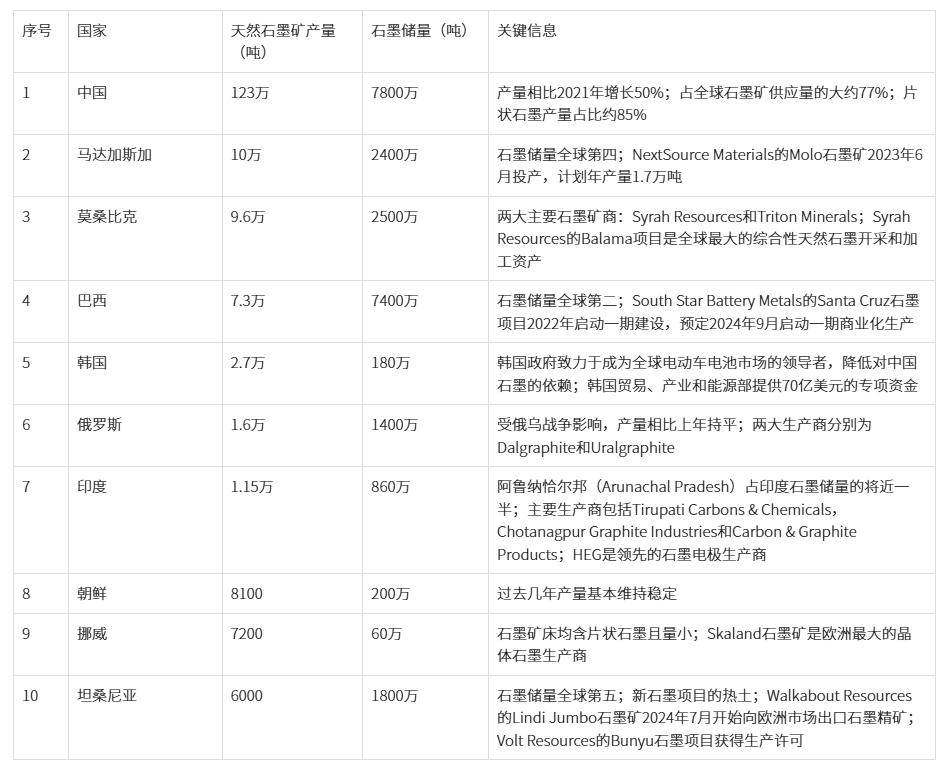 根據(jù)美國(guó)地質(zhì)勘探局的數(shù)據(jù),以下是全球天然石墨礦產(chǎn)量最高的十個(gè)國(guó)家以及它們的石墨儲(chǔ)量: