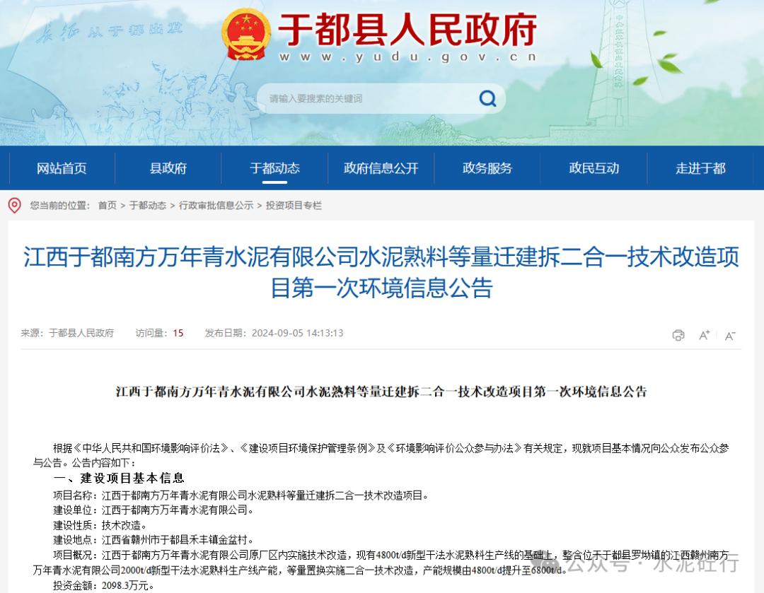 日前,江西于都縣人民政府發(fā)布《江西于都南方萬年青水泥有限公司水泥熟料等量遷建拆二合一技術(shù)改造項目第一次環(huán)境信息公告》。