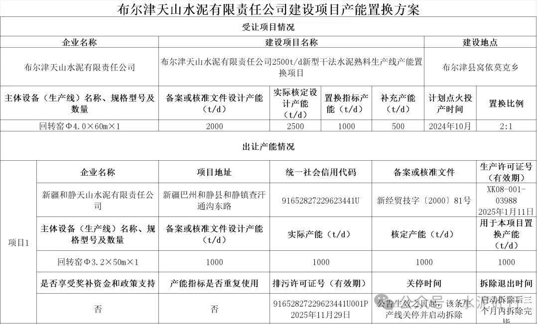 根據(jù)公示,布爾津天山水泥有限責(zé)任公司2500t/d新型干法水泥熟料生產(chǎn)線產(chǎn)能置換項(xiàng)目補(bǔ)充產(chǎn)能500t/d,置換比例2:1。