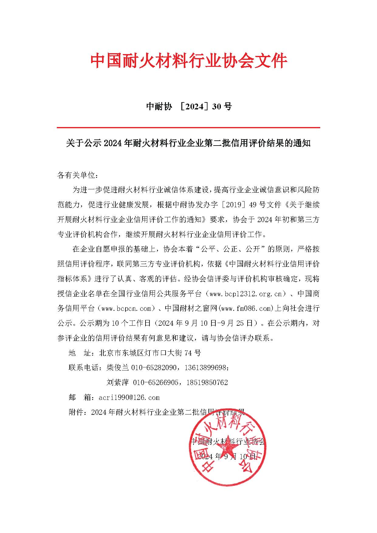 關(guān)于公示2024年耐火材料行業(yè)企業(yè)第二批信用評(píng)價(jià)結(jié)果的通知