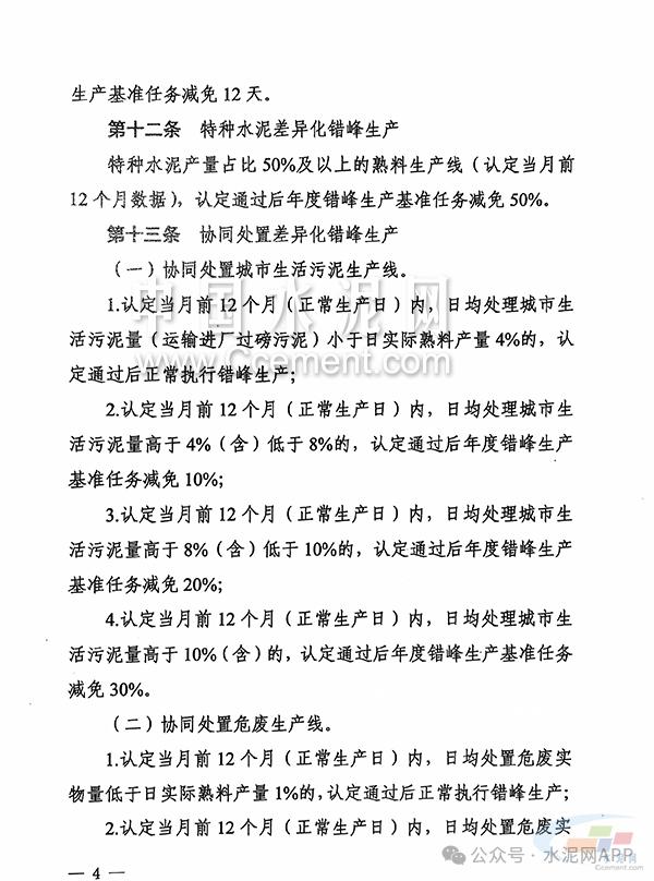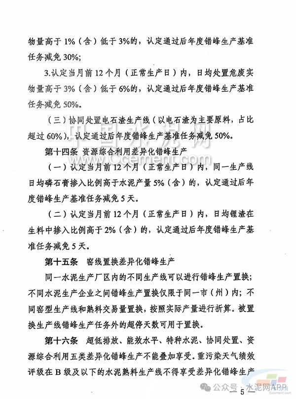 《細(xì)則》指出,有全年協(xié)同處置城市生活垃圾及有毒有害廢棄物等任務(wù)的生產(chǎn)線可以不進(jìn)行錯峰生產(chǎn),但要適當(dāng)降4低水泥生產(chǎn)負(fù)荷。 《細(xì)則》提到,同一水泥生產(chǎn)廠區(qū)內(nèi)的不同生產(chǎn)線可以進(jìn)行錯峰生產(chǎn)置換;不同水泥生產(chǎn)企業(yè)之間錯峰生產(chǎn)置換僅限于同一市(州)內(nèi);不同窯型生產(chǎn)線和熟料交易量置換,按照實際產(chǎn)量進(jìn)行折算。被置換生產(chǎn)線錯峰生產(chǎn)任務(wù)外的超停天數(shù)可用于置換。 《細(xì)則》還明確了,超低排放差異化、能效水平差異化、特種水泥差異化、協(xié)同處置差異化、資源綜合利用差異化、密線置換差異化等六種條件下的錯峰生產(chǎn)要求。但超低排放、能效水平、特種水泥、協(xié)同處置、資源綜合利用五類差異化錯峰生產(chǎn)不能疊加享受。重污染天氣績效評級在B級及以下的水泥熟料生產(chǎn)線不得享受差異化錯峰生產(chǎn)減免。