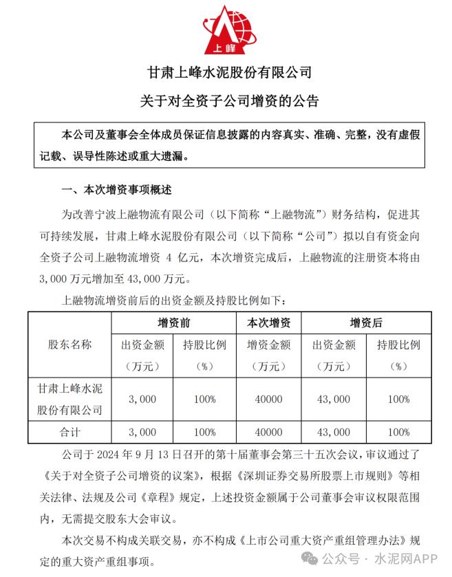 上峰水泥9月13日晚間公告,公司擬以自有資金向全資子公司上融物流增資4億元,本次增資完成后,上融物流的注冊資本將由3000萬元增加至4.3億元。本次增資為進一步改善和優(yōu)化寧波上融物流有限公司財務(wù)結(jié)構(gòu),促進可持續(xù)發(fā)展,本次增資的資金來源為公司自有資金,不會對公司財務(wù)和經(jīng)營狀況產(chǎn)生不利影響,不存在損害公司及股東利益的情形。