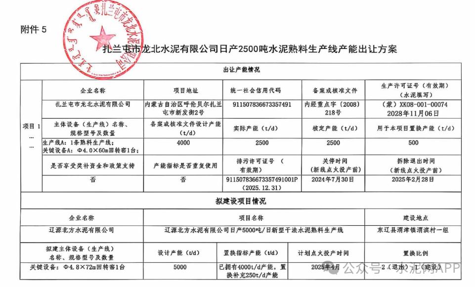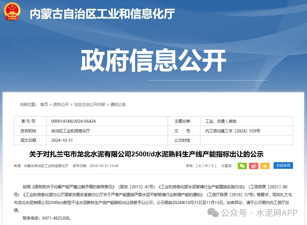 10月31日,內(nèi)蒙古工信廳發(fā)布“關(guān)于對(duì)扎蘭屯市龍北水泥有限公司2500t/d水泥熟料生產(chǎn)線產(chǎn)能指標(biāo)出讓的公示”。
