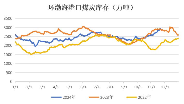 近期國內(nèi)煤炭供應持續(xù)高位,進入冬季用煤高峰,政府表態(tài)要求推進煤炭保供工作,12月份國內(nèi)煤炭供應仍有增量空間。大秦線秋季檢修結束后,鐵路運輸能力充足釋放,持續(xù)保持發(fā)運量高位,港口輸入量多、消耗量少,煤炭庫存持續(xù)升高。截至目前,環(huán)渤海港口庫存總庫存2924.6萬噸,已近逼近3000萬噸大關,位于同期較高水平。當前全國統(tǒng)調(diào)電廠存煤保持在2億噸以上、平均可用超過30天,終端整體庫存充足,補貨意愿不強。非電行業(yè)也沒有有力支撐,所以僅僅維持剛需采購。