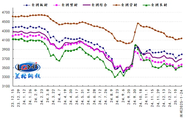 2025年第3周(2025.1.13-1.17)蘭格鋼鐵全國絕對價格指數(shù)為3670元,較上周上升1.3%,較去年同期下降13.6%;其中,蘭格鋼鐵長材絕對價格指數(shù)為3510元,較上周上升1.4%,較去年同期下降13.9%;蘭格鋼鐵型材絕對價格指數(shù)為3538元,較上周上升1.5%,較去年同期下降15.2%;蘭格鋼鐵板材絕對價格指數(shù)為3765元,較上周上升1.5%,較去年同期下降13.7%;蘭格鋼鐵管材絕對價格指數(shù)為4121元,較上周上升0.3%,較去年同期下降10.7%。