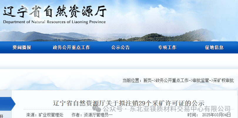 根據(jù)《礦產(chǎn)資源開采登記管理辦法》(國務(wù)院令第241號)第七條規(guī)定,采礦權(quán)人逾期不辦理延續(xù)登記手續(xù),義縣金羽螢石礦等29個采礦許可證已自行廢止。按照《自然資源部關(guān)于進一步完善礦產(chǎn)資源勘查開采登記管理的通知》(自然資規(guī)〔2023〕4號)有關(guān)要求,我廳擬對上述采礦許可證予以公告注銷,現(xiàn)進行公示。
