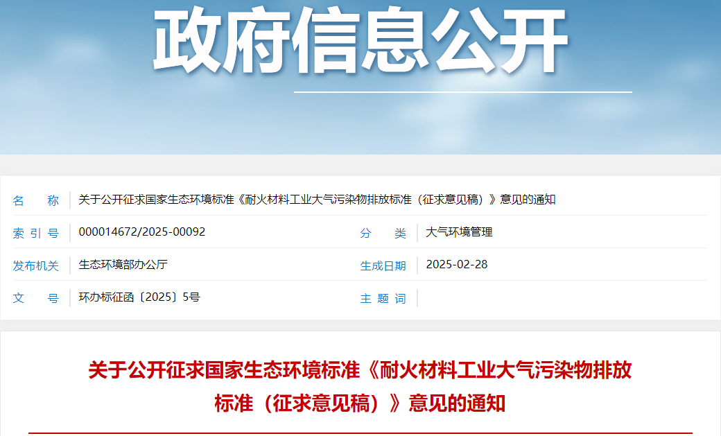 為貫徹《中華人民共和國(guó)環(huán)境保護(hù)法》和《中華人民共和國(guó)大氣污染防治法》,完善國(guó)家大氣污染物排放標(biāo)準(zhǔn)體系,促進(jìn)環(huán)境空氣質(zhì)量改善,我部組織編制了國(guó)家生態(tài)環(huán)境標(biāo)準(zhǔn)《耐火材料工業(yè)大氣污染物排放標(biāo)準(zhǔn)(征求意見(jiàn)稿)》,現(xiàn)公開征求意見(jiàn)。征求意見(jiàn)稿和編制說(shuō)明可在我部網(wǎng)站(http://www.mee.gov.cn/)“意見(jiàn)征集”欄目檢索查閱。
