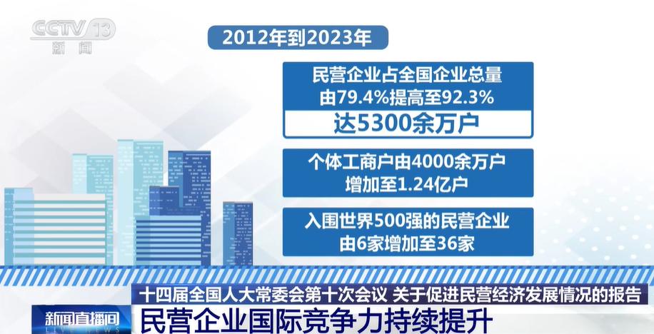 報(bào)告稱,民營(yíng)經(jīng)濟(jì)規(guī)模實(shí)力持續(xù)提升,2012年到2023年,民營(yíng)企業(yè)占全國(guó)企業(yè)總量由79.4%提高至92.3%,達(dá)5300余萬戶,個(gè)體工商戶由4000余萬戶增加至1.24億戶,入圍世界500強(qiáng)的民營(yíng)企業(yè)由6家增加至36家;民營(yíng)經(jīng)濟(jì)創(chuàng)新水平持續(xù)提升,2012年到2022年,國(guó)家高新技術(shù)企業(yè)中民營(yíng)企業(yè)從2.8萬家增長(zhǎng)至35.9萬家,占比由62.4%提升至90.9%。