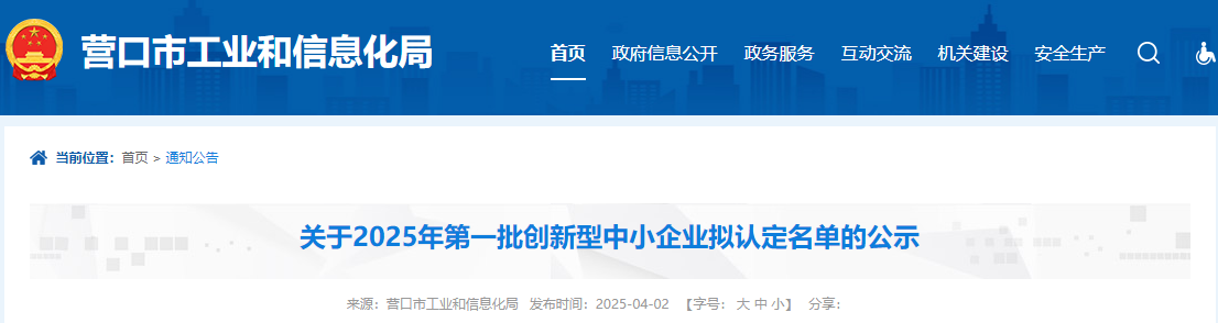 按省工信廳《關(guān)于做好2025年度創(chuàng)新型中小企業(yè)申報工作的通知》要求,經(jīng)企業(yè)登錄優(yōu)質(zhì)中小企業(yè)梯度培育平臺自愿申報,各縣(市)區(qū)、園區(qū)工信主管部門推薦,市工信局初審,擬認(rèn)定營口盛和耐材制造有限公司等10家企業(yè)為2025年第一批創(chuàng)新型中小企業(yè),現(xiàn)將通過名單予以公示。任何單位或個人對公示有異議的,可在公示期內(nèi)與市工信局聯(lián)系。