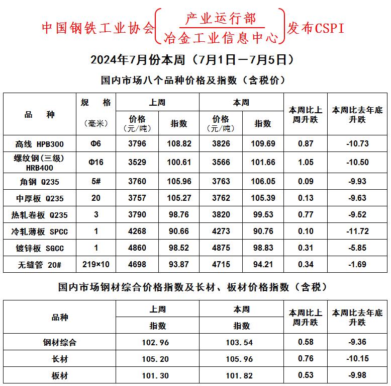2024年7月份本周(7月1日-7月5日)國內市場八個品種價格及指數
