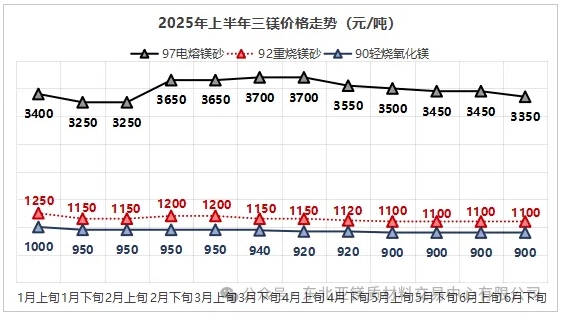 2025年1、2月份,下游鋼鐵、水泥等高溫行業(yè)需求不佳,很多企業(yè)春節(jié)假期提前了近一個(gè)月,廠家報(bào)價(jià)基本穩(wěn)定并未出現(xiàn)明顯波動(dòng)。但2月下旬起,電熔鎂砂價(jià)格開(kāi)始上漲,其原因是國(guó)內(nèi)外石墨電極價(jià)格開(kāi)始呈上漲趨勢(shì),同時(shí)傳出遼寧地區(qū)3月初電費(fèi)價(jià)格將迎來(lái)大調(diào)整的消息。2月底電熔鎂砂生產(chǎn)企業(yè)紛紛調(diào)整價(jià)格,并表示電價(jià)正式調(diào)整后,產(chǎn)品價(jià)格會(huì)再次上調(diào),期間很多龍頭企業(yè)已停止報(bào)價(jià)。3月初遼寧地區(qū)電熔鎂砂類(lèi)產(chǎn)品報(bào)價(jià)再次大幅上漲,重?zé)V砂企業(yè)也在嘗試跟風(fēng)調(diào)價(jià),但因企業(yè)庫(kù)存積壓太多,下游行業(yè)需求又持續(xù)降低,重?zé)V砂調(diào)價(jià)缺少支撐并未得到市場(chǎng)認(rèn)可。而輕燒氧化鎂也受出口和國(guó)內(nèi)硫酸鎂市場(chǎng)下行影響,價(jià)格呈下降趨勢(shì),其中90輕燒氧化鎂因其用途主要是供脫硫使用,出貨量相對(duì)較好。期間,97高純鎂砂降價(jià)后報(bào)價(jià)比95中檔鎂砂還便宜50元/噸,導(dǎo)致部分中檔鎂砂企業(yè)銷(xiāo)售量銳減,庫(kù)存積壓嚴(yán)重不得已停產(chǎn)。5、6月份各類(lèi)鎂砂產(chǎn)品價(jià)格時(shí)有波動(dòng),但相對(duì)穩(wěn)定。