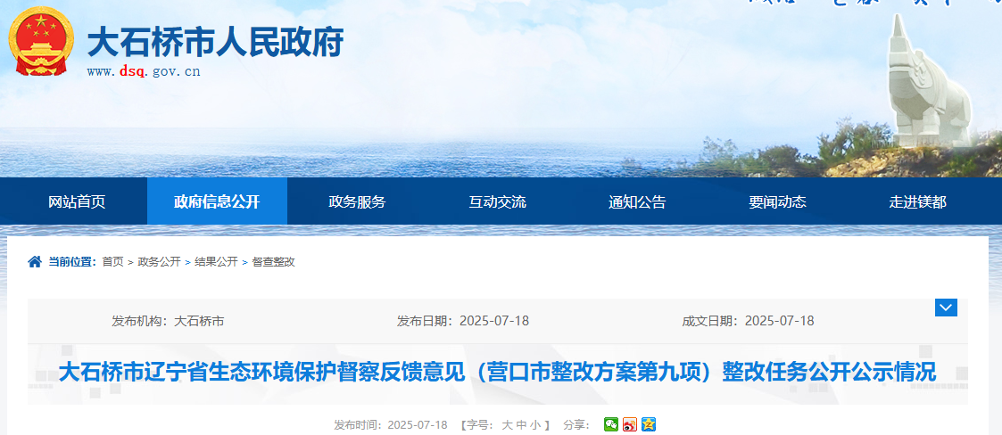以上整改情況向社會公示,如有異議,請以書面或電話形式,向大石橋市環(huán)境保護(hù)督察整改工作領(lǐng)導(dǎo)小組辦公室、營口市大石橋生態(tài)環(huán)境分局反映。