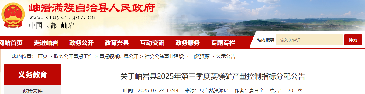 根據(jù)鞍山市菱鎂產(chǎn)業(yè)發(fā)展工作專班《關(guān)于下達(dá)鞍山市2025年第3季度菱鎂礦產(chǎn)量控制指標(biāo)的通知》(鞍鎂專班〔2025〕5號(hào)),現(xiàn)對(duì)岫巖縣2025年第三季度菱鎂礦產(chǎn)量控制指標(biāo)分配情況予以公告。