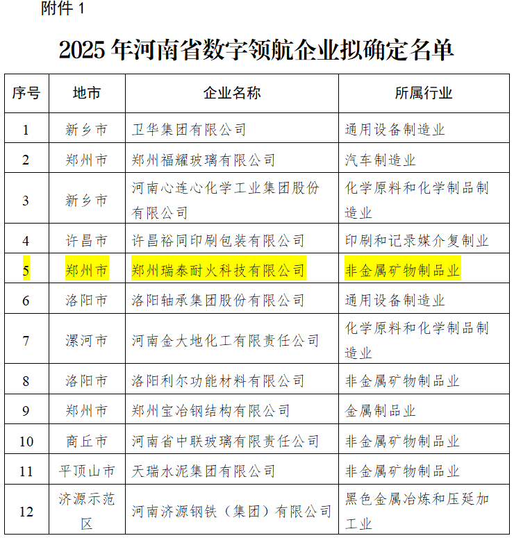 近日,河南省工業(yè)和信息化廳公示了2025年河南省數(shù)字領航企業(yè)、數(shù)字化轉型“小燈塔”企業(yè)、服務型制造創(chuàng)新企業(yè)(平臺)名單,鄭州瑞泰耐火科技有限公司成功榮獲“2025年河南省數(shù)字領航企業(yè)”稱號。